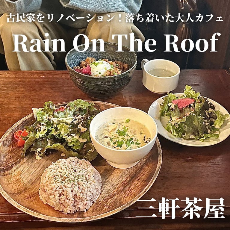 三軒茶屋の古民家をリノベーションした大人のカフェ、Rain On The Roof。2階の中央にクリスマスツリー、約36席の落ち着いた空間。11:30-23:00、ランチには日替わりルーロー飯など、自家製チャイと作りたてスイーツが魅力です。