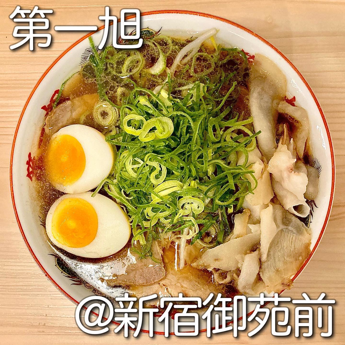京都の老舗・第一旭新宿店の豚骨ベース醤油ラーメン。九条ねぎと薄切りチャーシュー、細麺の組み合わせが定番で、シロミや味玉の追加も人気。新宿御苑前駅すぐの小さなお店で、回転の良さも魅力です。