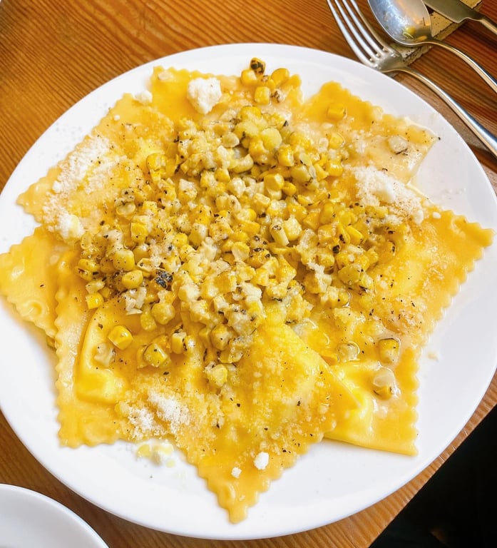 "自家製リコッタチーズのラビオリ 焼きとうもろこしのバターソース"