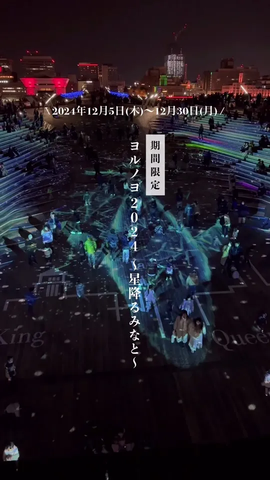 夜の横浜を彩る光と音楽のショー『ヨルノヨ』は、波打つウッドデッキ上で海上プロジェクションマッピングを展開します。クジラが横浜港を泳ぐ圧巻の演出で、入場無料。大さん橋周辺で午後5時〜9時5分、令和6年1月4日まで。