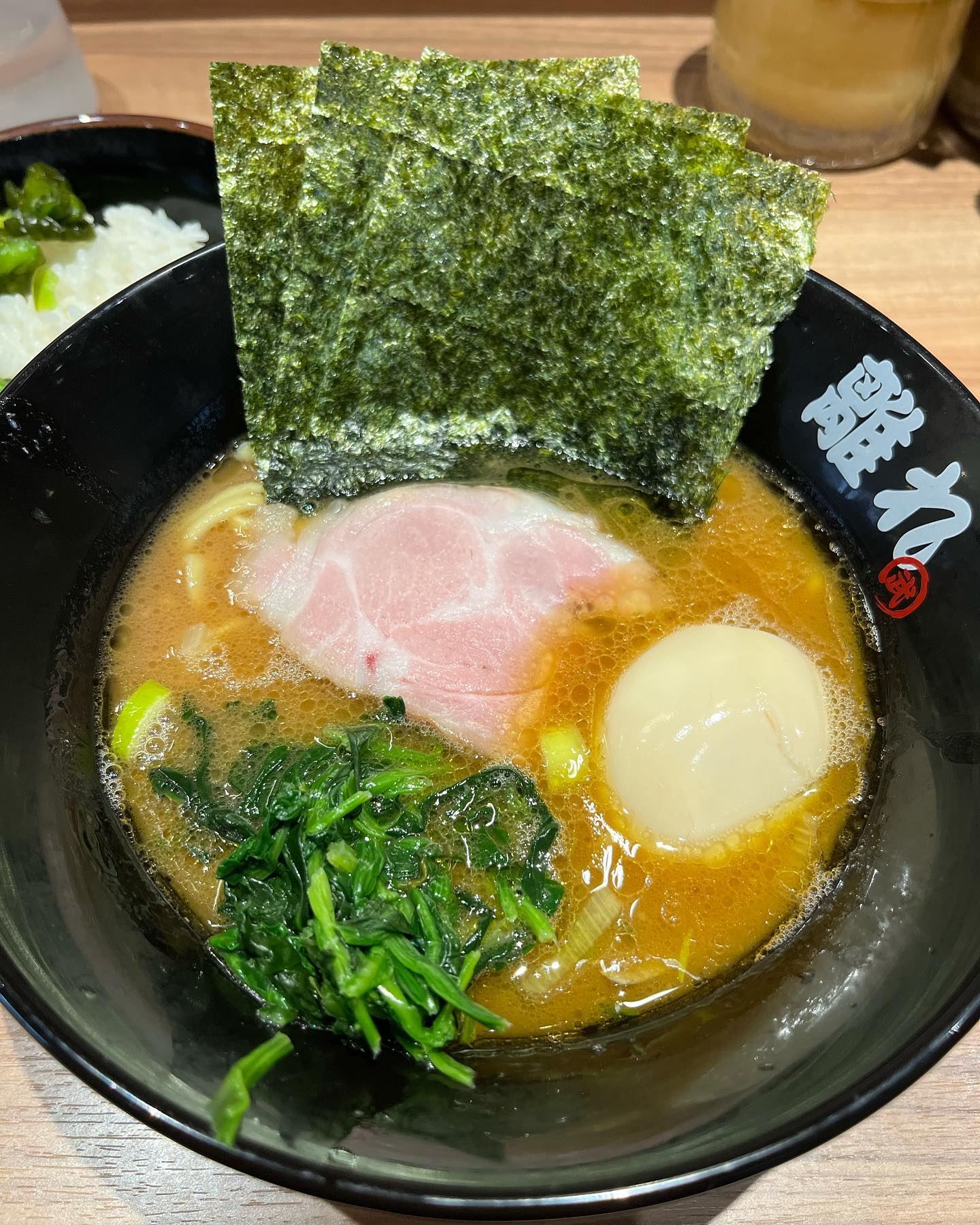 成増の武蔵家 HANAREは、醤油の旨みが先行する濃厚スープと短め中太麺が特徴の家系ラーメンです。おすすめは上離れの2種チャーシューと味玉。ご飯は無料で、卓上の特製ラー油・七味醤油漬け・マヨの組み合わせも楽しめます。