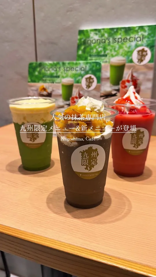九州で人気の抹茶専門店、nana's green tea アミュプラザ鹿児島店。鹿児島限定の安納芋とほうじ茶フローズン、抹茶フローズンミルクセーキ風、あまおう苺フローズンなど九州の素材を活かした限定メニューと、新登場のマンゴー系デザート3品を展開。テイクアウト可・イートイン可・駐車場有。営業時間は10:00〜20:00頃。