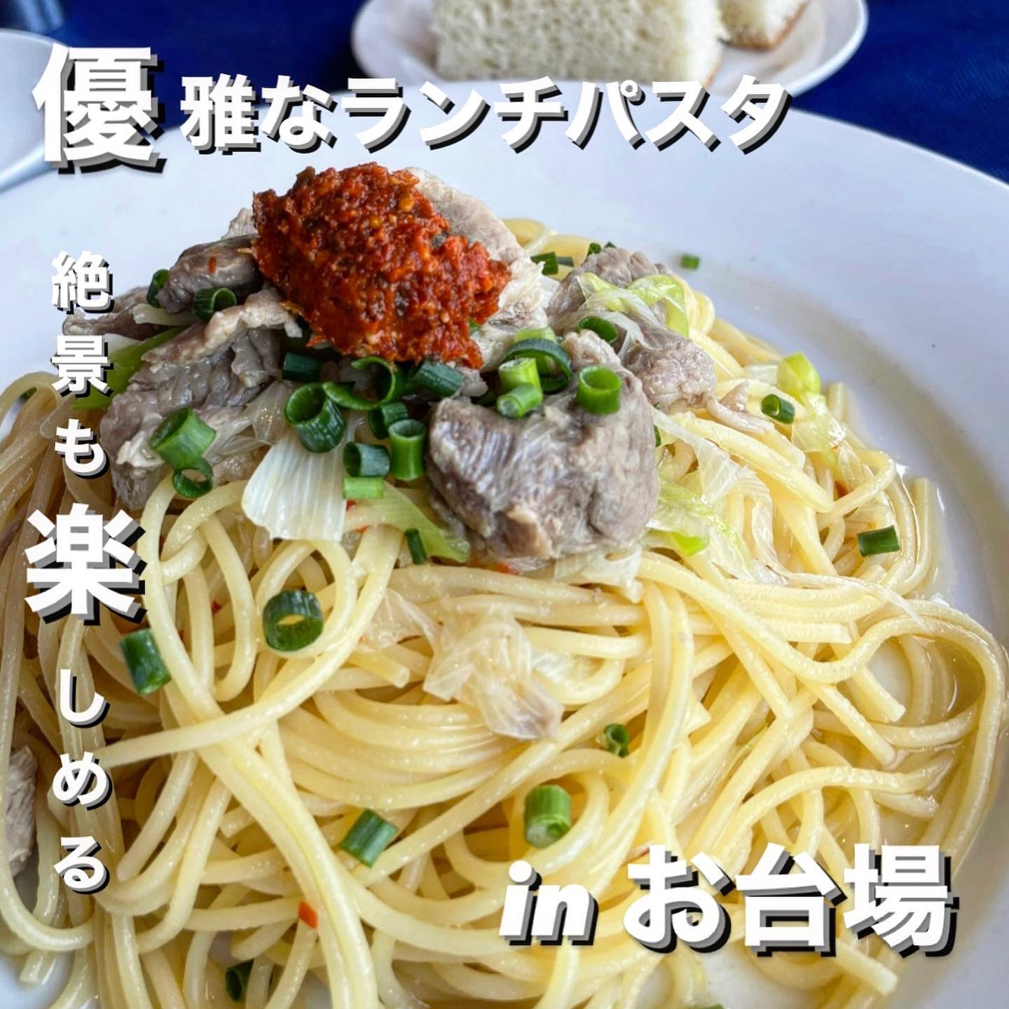 お台場の贅沢イタリアン、ペッシェドーロお台場店です。レインボーブリッジ前の絶景席が魅力です。日替わりパスタはサラダ・パン・ドリンク・大盛り付きで¥1050と驚きのコスパです。牛すじと香味野菜のペペロンチーノは柚子胡椒と相性抜群、牛すじもホロホロです。自家製フォカッチャはモチモチで、残ったソースをパンにつけたガーリックトーストも絶品です。接客も丁寧で昼夜問わず人気です。
