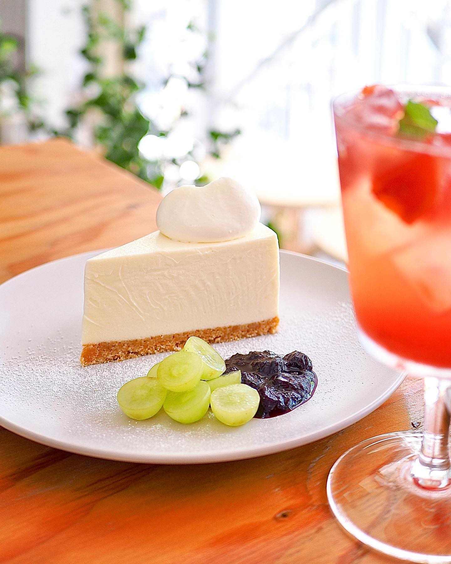 レアチーズケーキ デラウェアとブルーベリージャム添え。