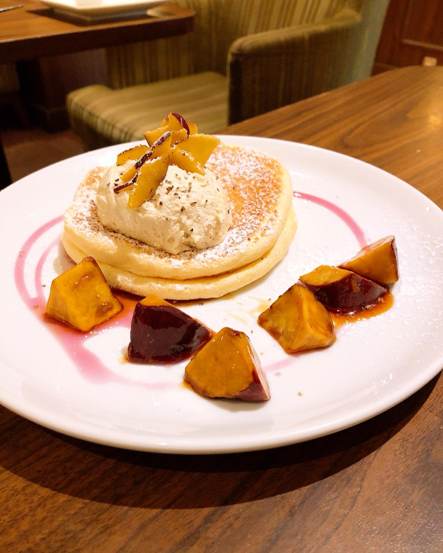 高倉町珈琲店はパンケーキが看板のカフェで、相模原店はふわふわ系を軸に展開。季節メニューには紅茶クリームシルキーやさつまいものリコッタパンケーキがあり、芋チップスとホイップの盛り付けが写真映えします。