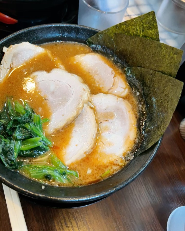 星川駅近くのカウンターのみ・食券制のコンパクトな店内。濃厚な豚骨スープと中太縮れ麺を軸に、黒ニンニクマー油ラーメンや肉味噌ラーメンなど幅広く展開。海苔でにんにくとほうれん草を包んで浸す食べ方がおすすめです。