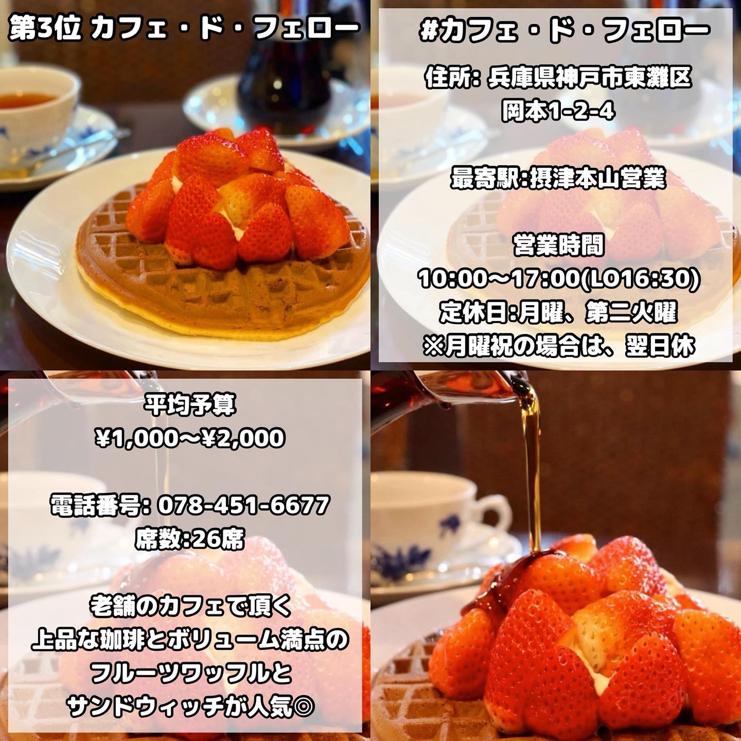 カフェ・ド・フェローは桃のワッフルが看板メニューのカフェです。摂津本山駅から徒歩1分の好立地で、10:00〜17:00の営業。月曜と第二火曜が休業日ですが、コロナ対策で営業時間・定休日が変更になる場合があります。