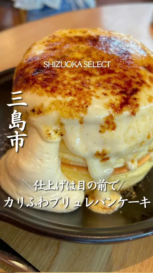 伊豆・三島市の卵料理専門カフェ TAMAGOYA。村の駅併設、大場駅徒歩15分。日の出カスタードのブリュレパンケーキや TAMAGOプリンパフェなど、ボリュームあるパンケーキとスイーツを提供。会計後席案内。卵色の照明が特徴。
