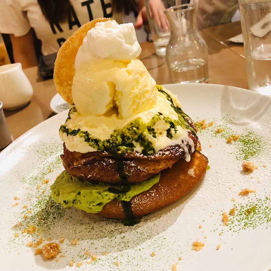 福岡1インパクトあるパンケーキ。桃が丸ごと1個贅沢に乗ってる。食べ応えあって桃のジューシーさがたまらない。詳細はこちら↓