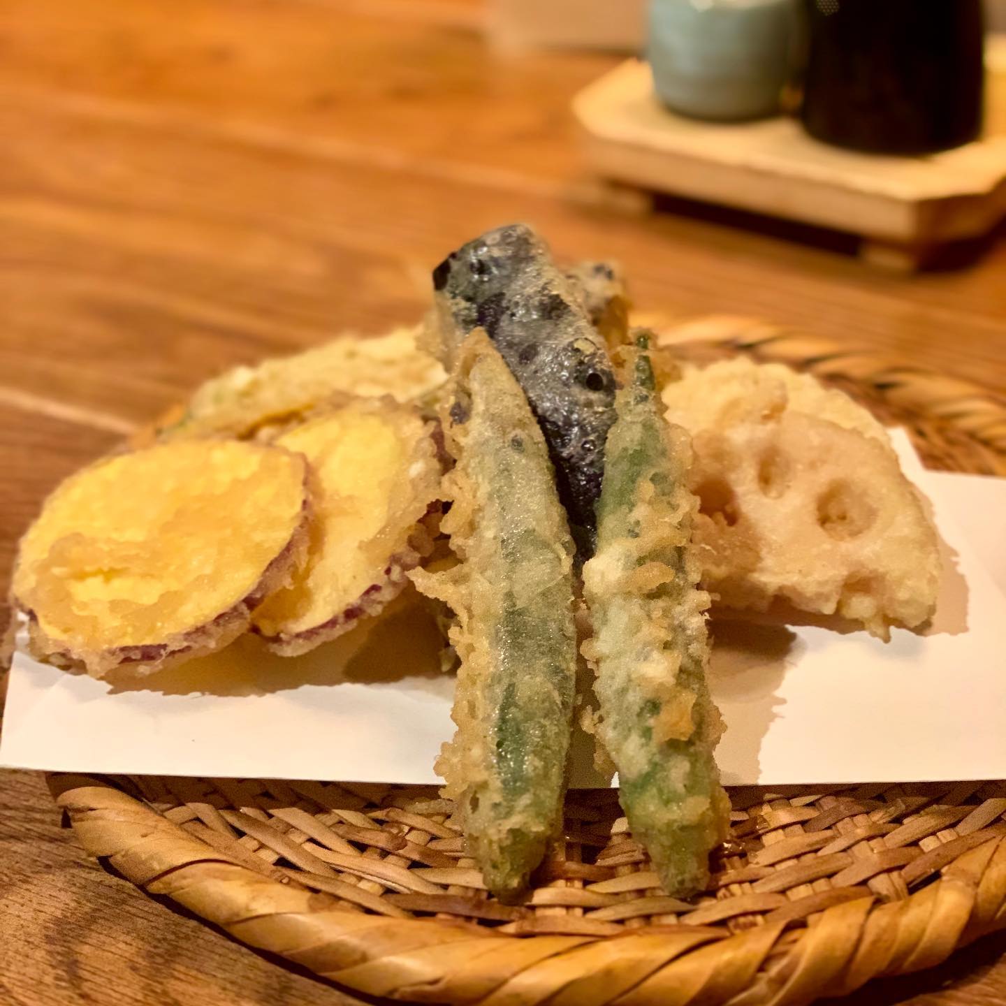 蕎麦の実コロッケ、ポテマカ、松茸と舞茸の天ぷらをつまみなが...