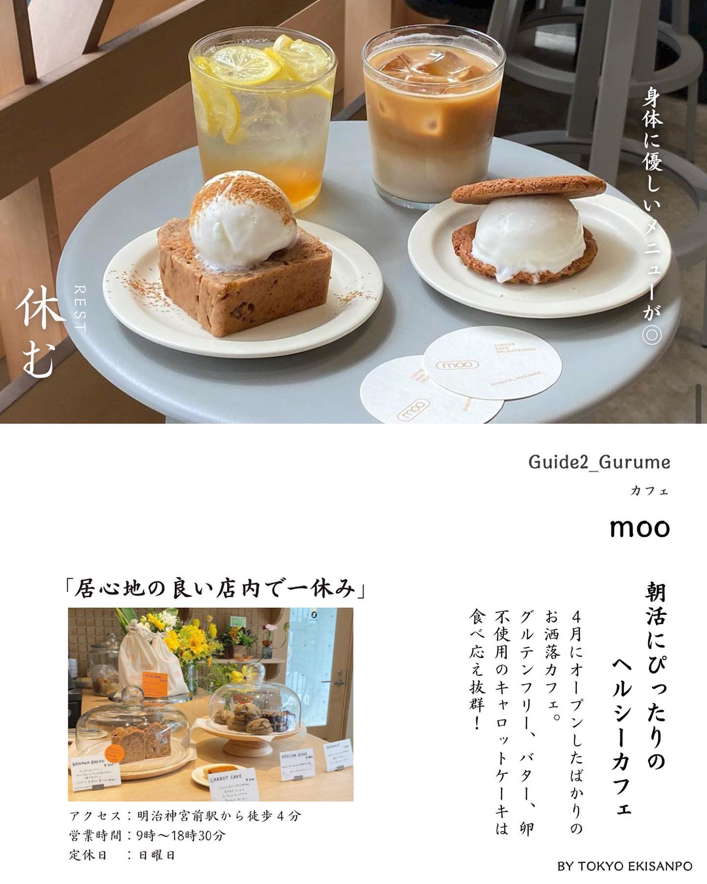 原宿の開放的で広々とした空間が魅力のカフェ moo。コンクリートと木の温かみが調和し、大窓から自然光が差し込む明るい内装です。約50席で混雑を感じにくく、キャロットケーキや自家製レモネードなど素材を活かしたスイーツとドリンクが楽しめます。原宿駅から徒歩圏・キャッシュレス対応・9:00-18:30営業。