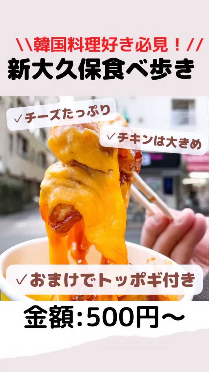 新大久保のテイクアウト専門店33トッポギは、注文後に作られる出来たて熱々の韓国料理が豊富。チーズたっぷりで伸びるチェダー+モッツァの組み合わせが特に人気。辛さはしっかり、チキンはカリッとジューシー。小サイズから選べ、味比べも楽しめます。