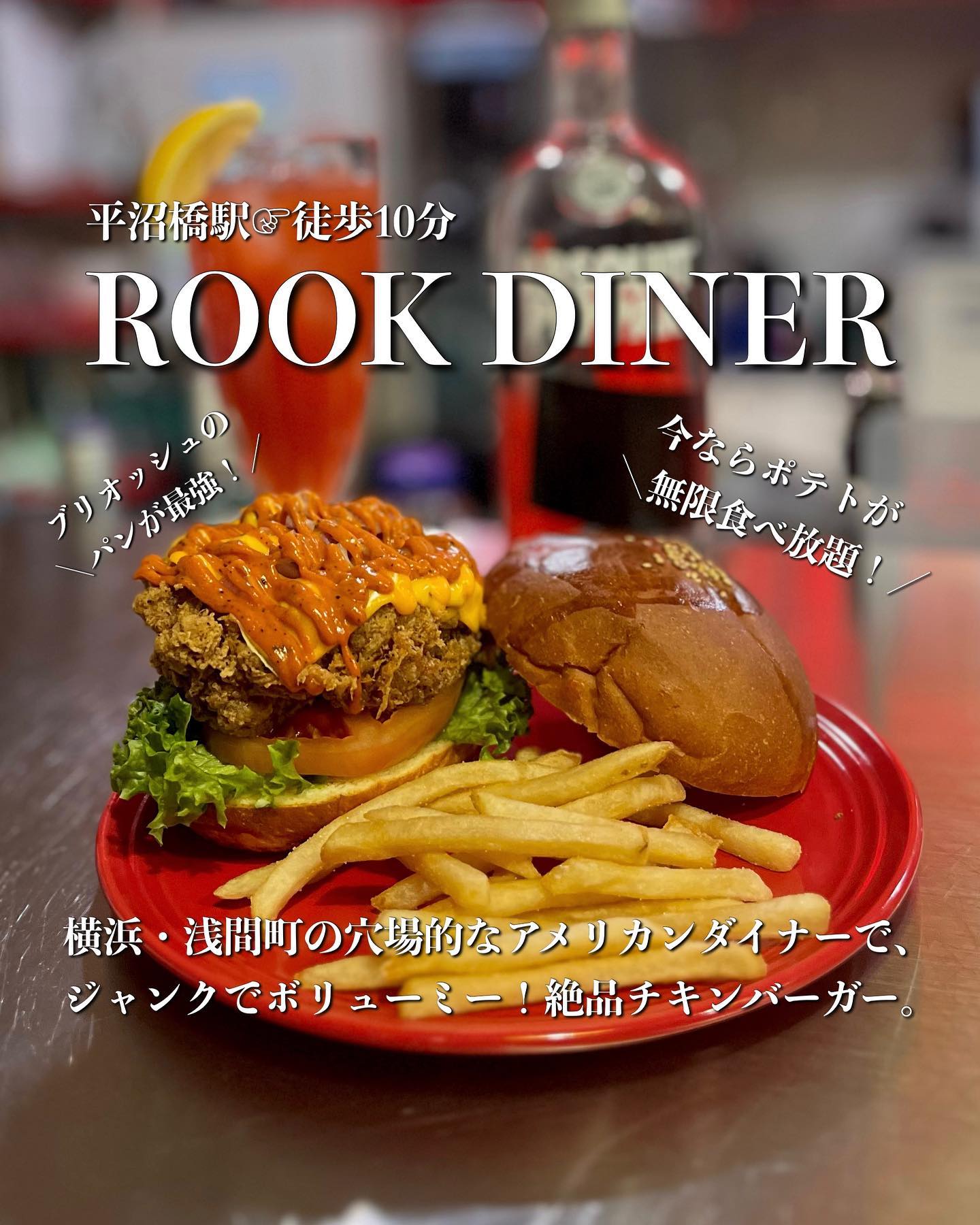 ROOK DINERは横浜西区のアメリカンダイナー。名物は分厚いチキンバーガー150gとふわふわブリオッシュ、5種のソース。注文ごとにフライドポテトが0円の無限サービス、アメコミ風の映え空間と横浜駅からのタクシー代補助も魅力。