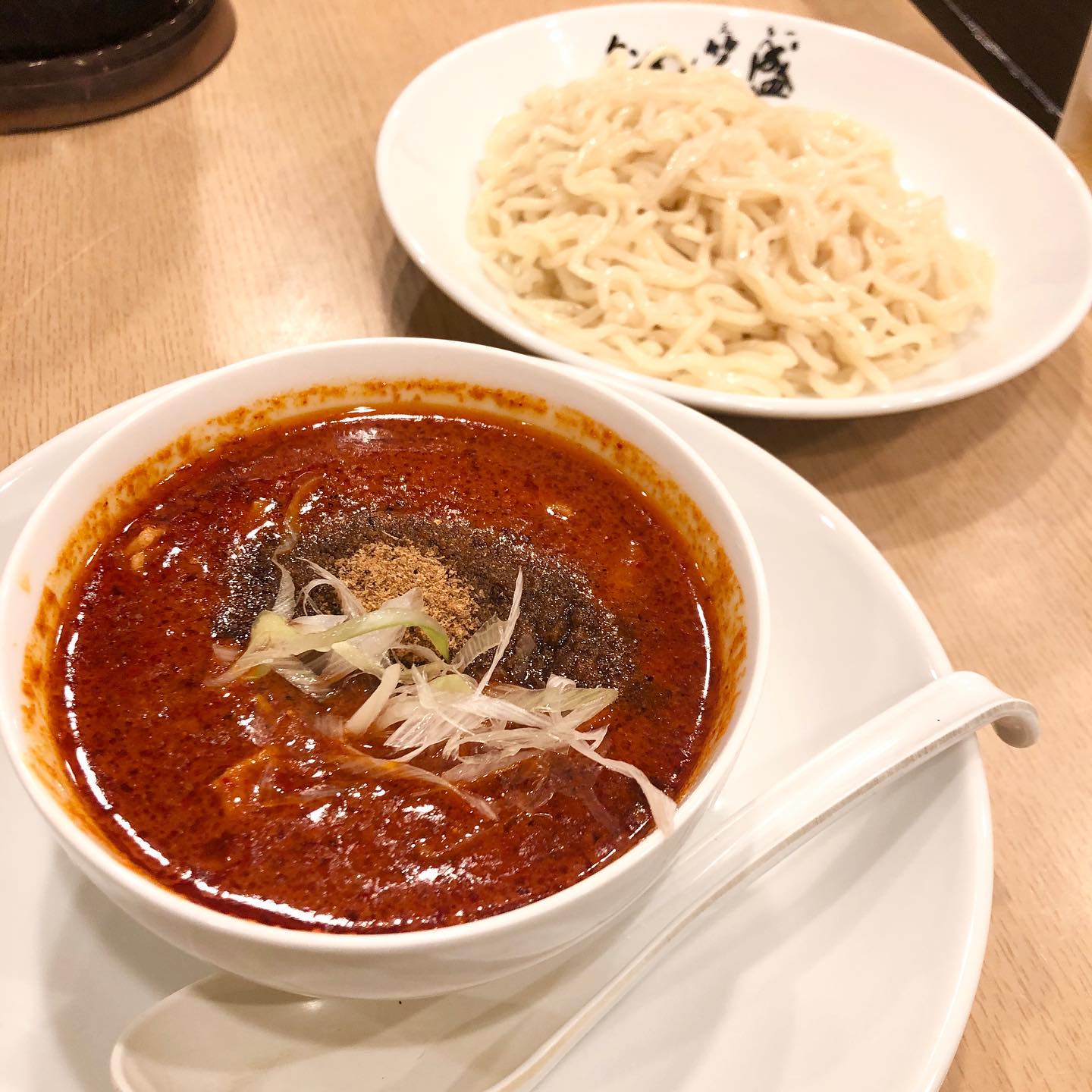 福岡市・天神南駅近くのタンメン笑盛 天神南店は、どろっと真っ赤な赤海タンメンが看板メニューです。辛さは北極を超える激辛で、笑盛スパイスは1辛20円で増量可能。麺はぷりぷりで、つけ麺や激辛メニューも充実しています。