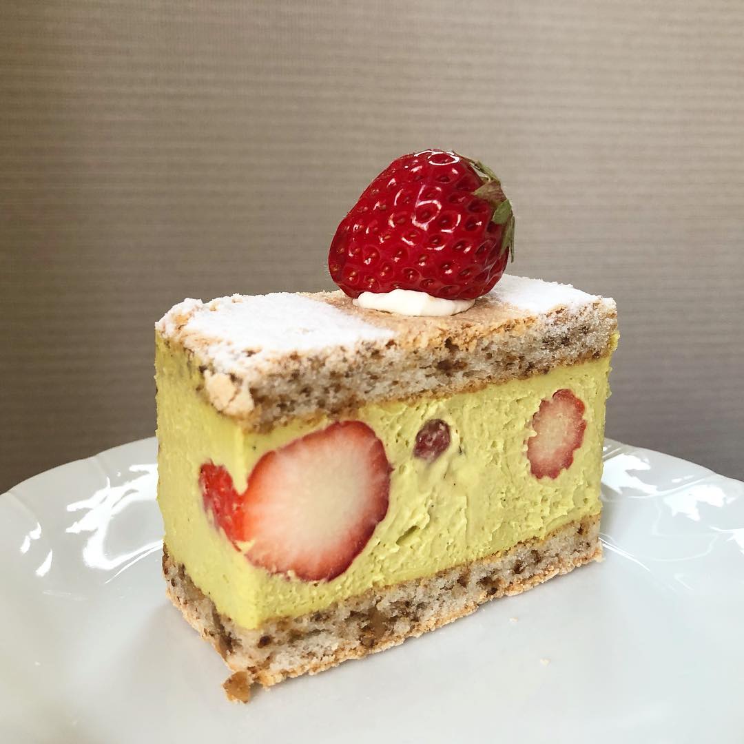 森ノ宮にある『マルナカ菓子店』は、2卓のイートインスペースを備えた小さなケーキ店です。定番のフレジェやガトーショコラ、レアチーズなど多彩なケーキが揃い、クリームはピスタチオを感じる緑が特徴です。