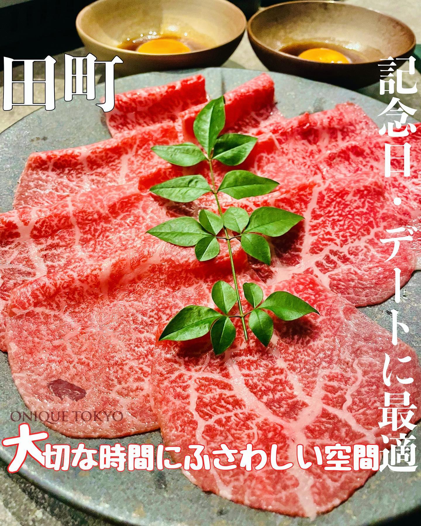 和牛を中心に据えた肉料理の専門店ONIQUE TOKYO。紀州備長炭で焼く炭火焼と土鍋ご飯が名物で、前菜・サラダ・スープも肉と連動したコースが特徴です。東京タワーが望める夜景と、誕生日を彩るおしゃれなバースデープレートが魅力です。
