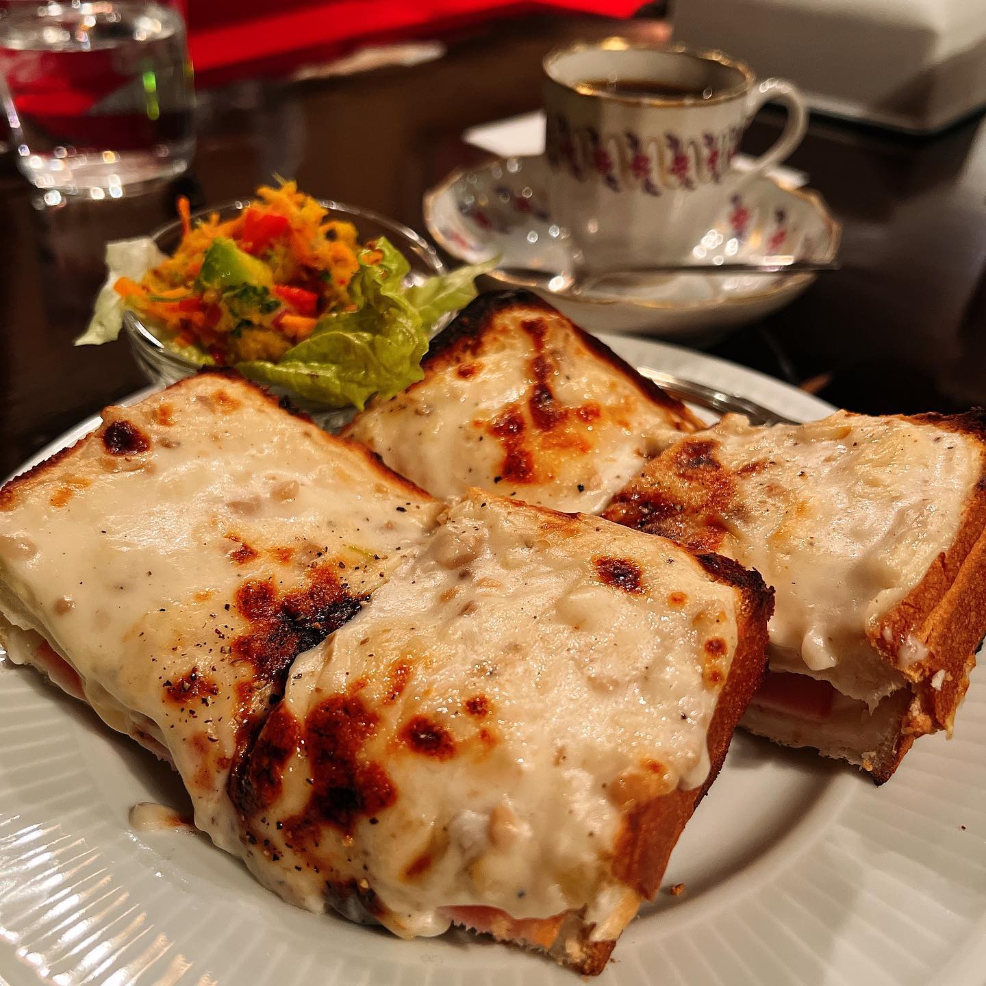 神保町のカフェ トロワバグは、グラタントーストが看板メニューです。パン2枚分のボリュームに、グラタンソースとチーズがとろりと溶け、ハムも入っています。サラダとコーヒーのセットは1200円です。地下へ降りる細い階段のレトロな雰囲気も魅力です。