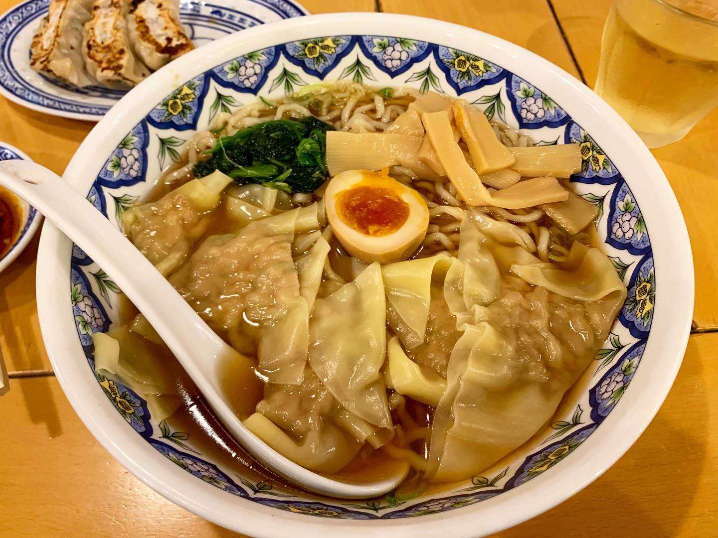 市川二俣の揚州商人は深夜4時まで営業。駐車場完備で車利用が便利。麺は3種類から選べ、タンタン麺は細麺柳麺、醤油ワンタン麺には海老ワンタン入りなど個性豊か。アプリ初回特典で餃子か杏仁豆腐が無料。ジャスミン茶の水も特徴。
