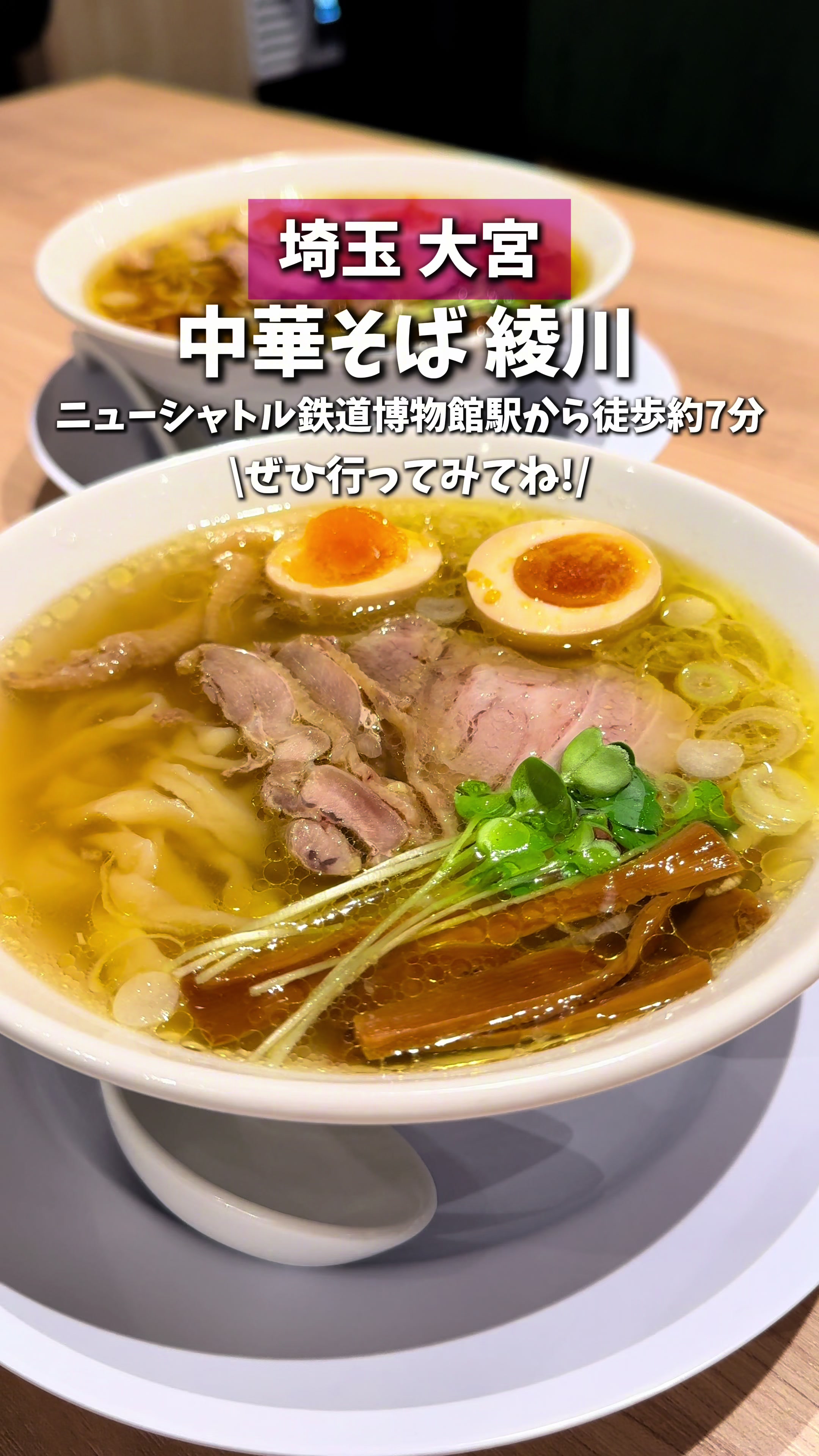 恵比寿の名店が埼玉に進出。『中華そば 綾川 大成店』は自家製の青手打ち麺と親鶏スープが織りなす中華そばが魅力です。醤油が定番ですが埼玉限定の塩ラーメンも人気。駐車場有り、11:00-22:00、鉄道博物館駅から徒歩約7分。