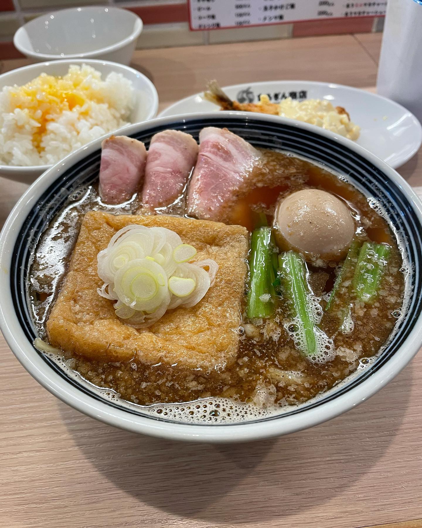 岡崎市のまるぎん商店は、天狗茄子を使った冷やしラーメンが季節限定で人気。細麺と濃厚なスープに加え、冷やしヴィシソワーズが付く斬新な味わいが特徴です。ほかにも元祖あごそばや油揚げ入りの特製メニューが楽しめます。