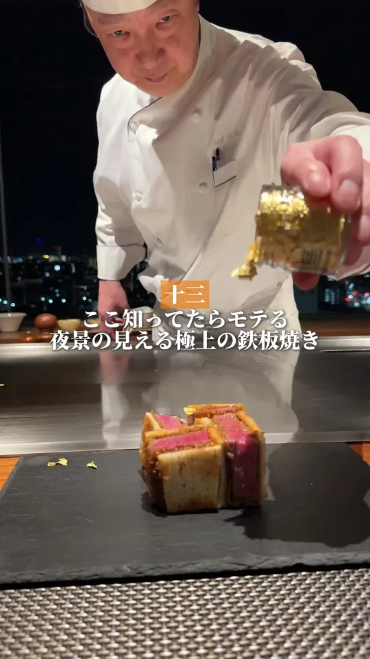 大阪・ホテルプラザオーサカ19階の鉄板焼き逢坂は、目の前でシャトーブリアンを焼く繊細さと、雌牛のみを厳選した但馬・オミ牛のこだわりが特徴。鉄板上ですき焼きを再解釈し、夜景を望む贅沢時間。予約必須です。