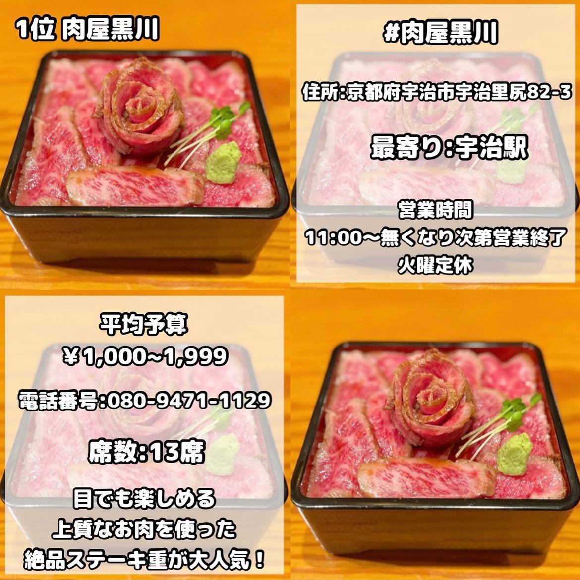 肉屋黒川 宇治本店は、輝くローストビーフ丼に花のようなバラの盛り付けが印象的な、上質なお肉を味わえる店です。お盆期間は8/18〜8/21は休業、毎週火曜が定休です。