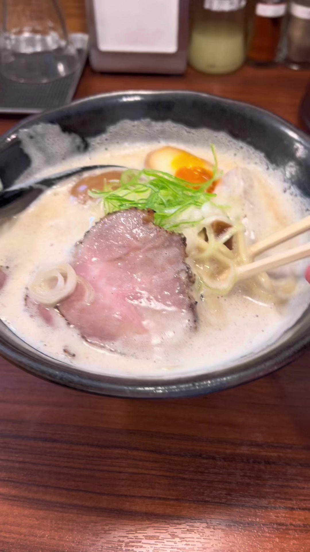 行列ができるつけ麺のお店のラーメンも絶品と聞いて行ってみた🍜まろやかでリッチなスープは、豚骨と水だけで作られてて魚介のタレが入ってるそう。噂に違わぬ素晴らしい一杯!!