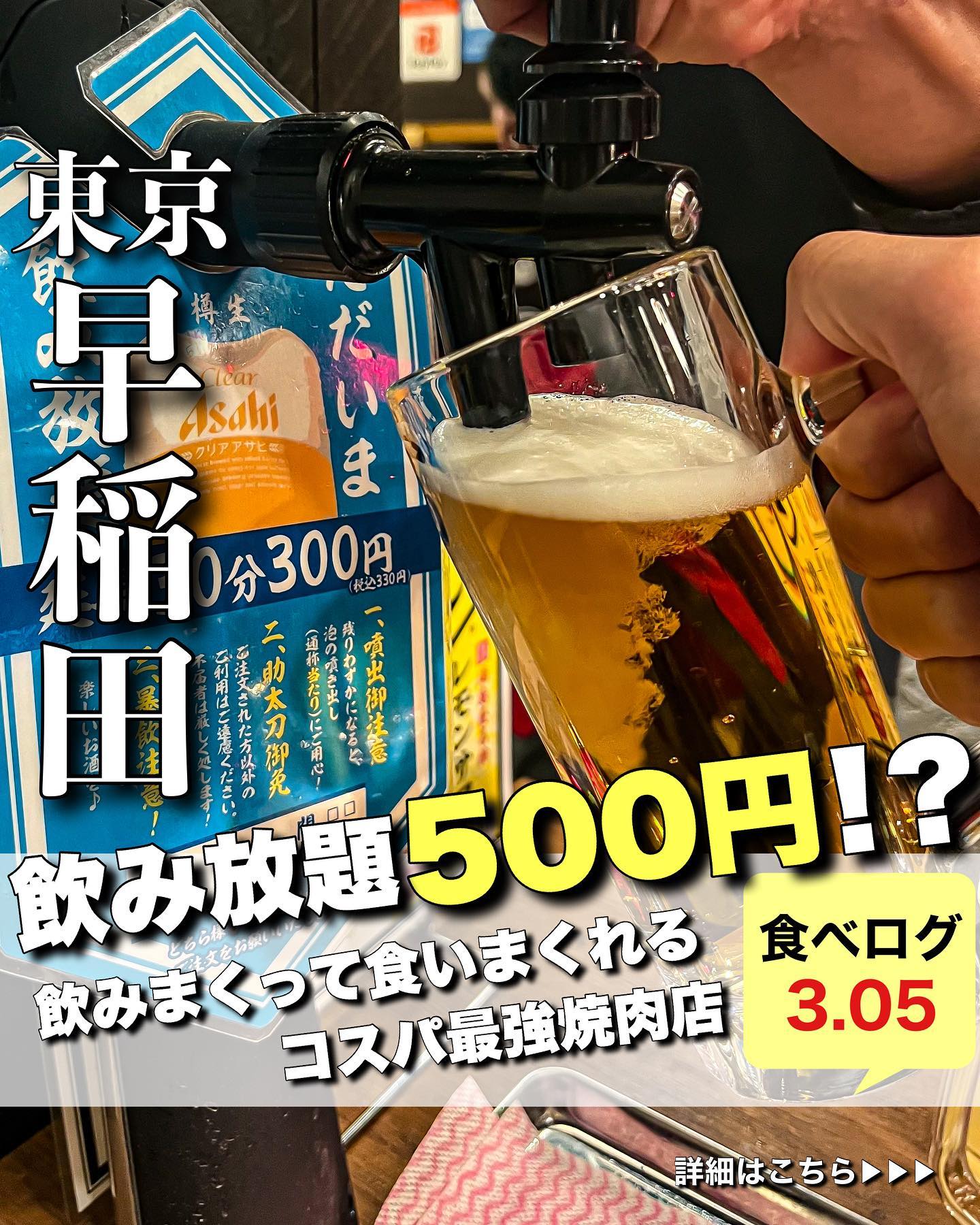早稲田店は高田馬場・早稲田エリアの高コスパ焼肉店。樽生ビール60分飲み放題が500円で、サーバー直のレモンサワーとビールを選択可能。浦島カルビ・上ハラミなど肉質良好、カウンターとテーブル席あり。昼のランチも実施。