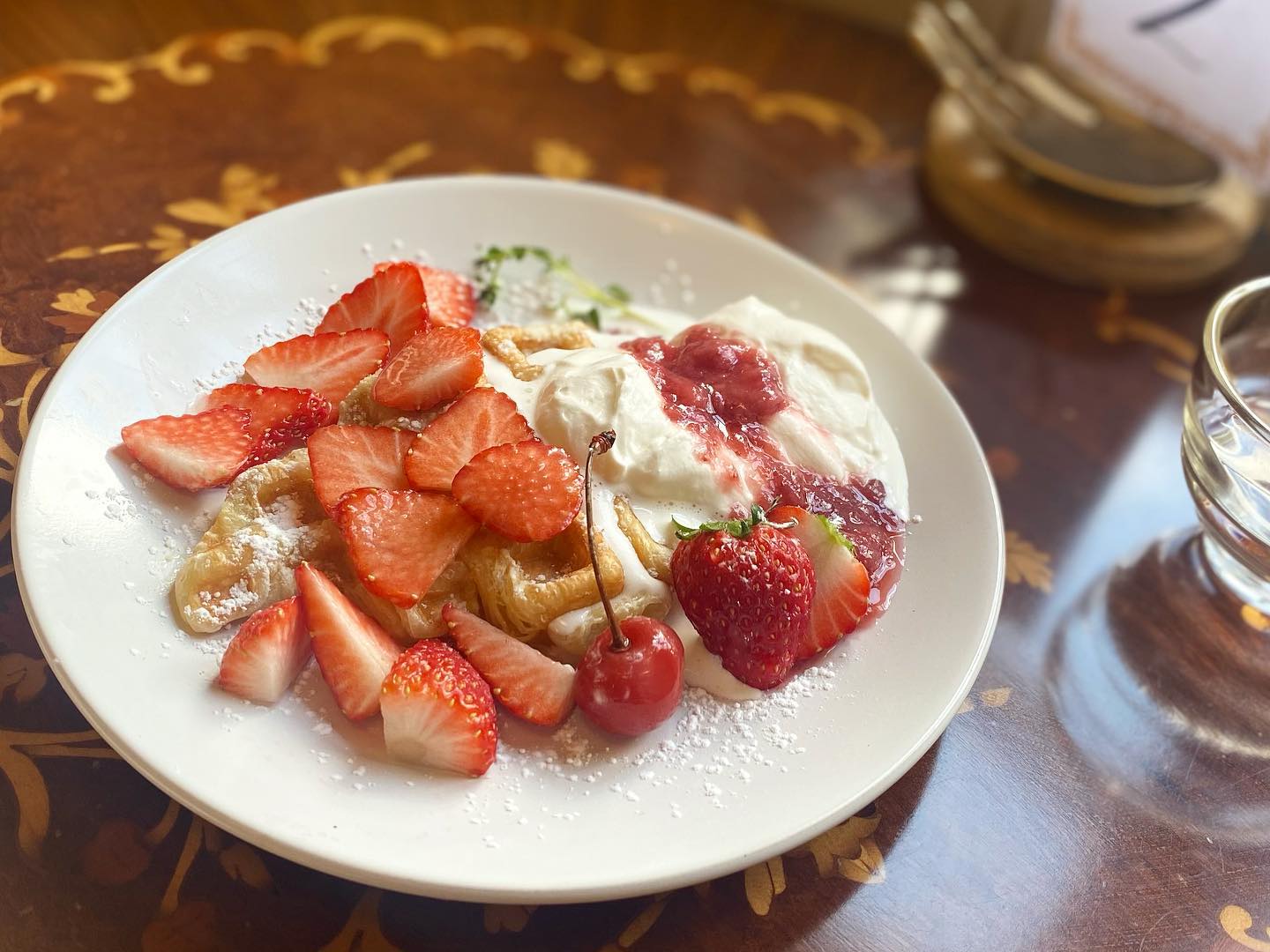 山形市・文翔館内にあるフルーツカフェです。季節の果実を使ったクロッフルが名物で、いちごやさくらんぼなど旬の味を楽しめます。クラシックな小物が映える店内で、巻物のようなメニュー表もこだわりです。営業時間は9:30〜16:30、席はカウンター・テーブル、駐車場有。定休日は文翔館の休館日と毎月1日、土日祝は平日に振替します。