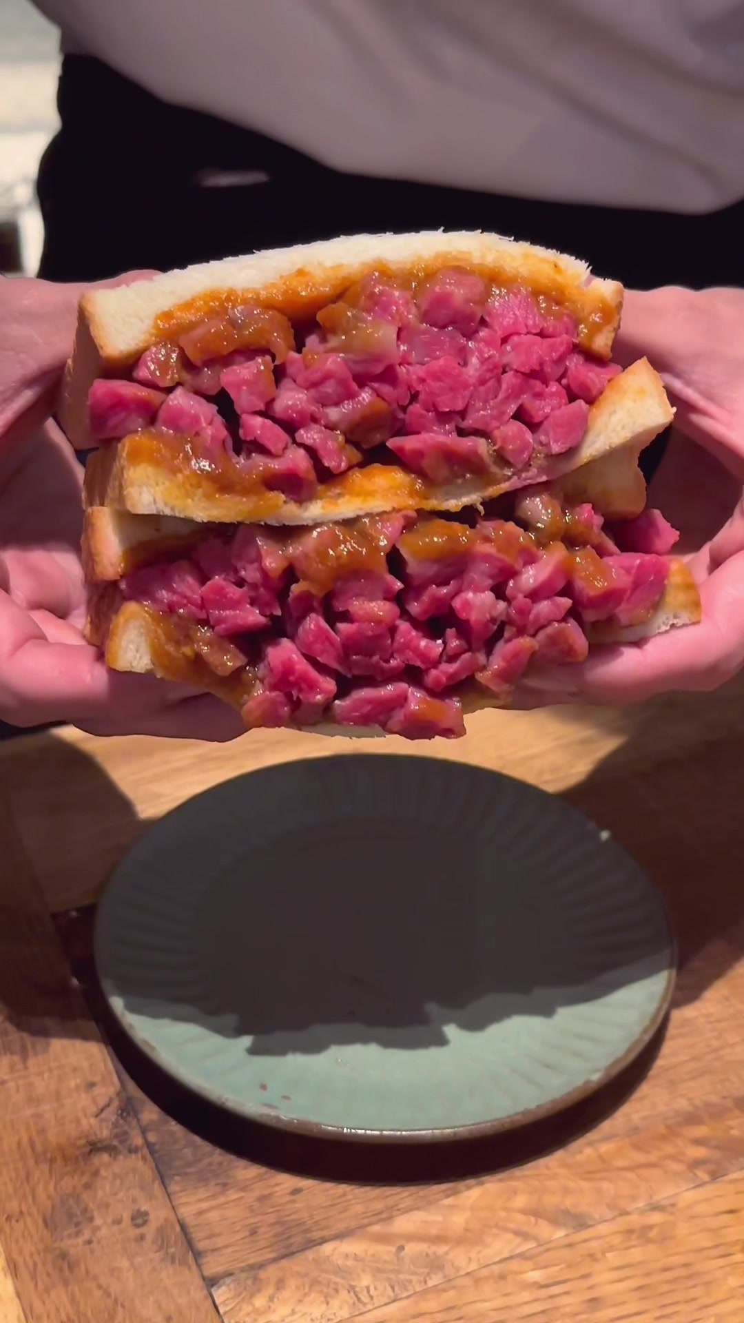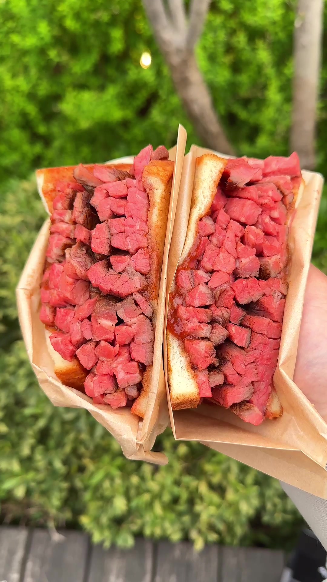 レアステーキをトーストにたくさん敷き詰めた肉パン!特製バーベキューソースとの相性も最高すぎた。大阪の梅田にあるピットマスターバモスっていうお店 #大阪グルメ #tiktokfood #japanfood