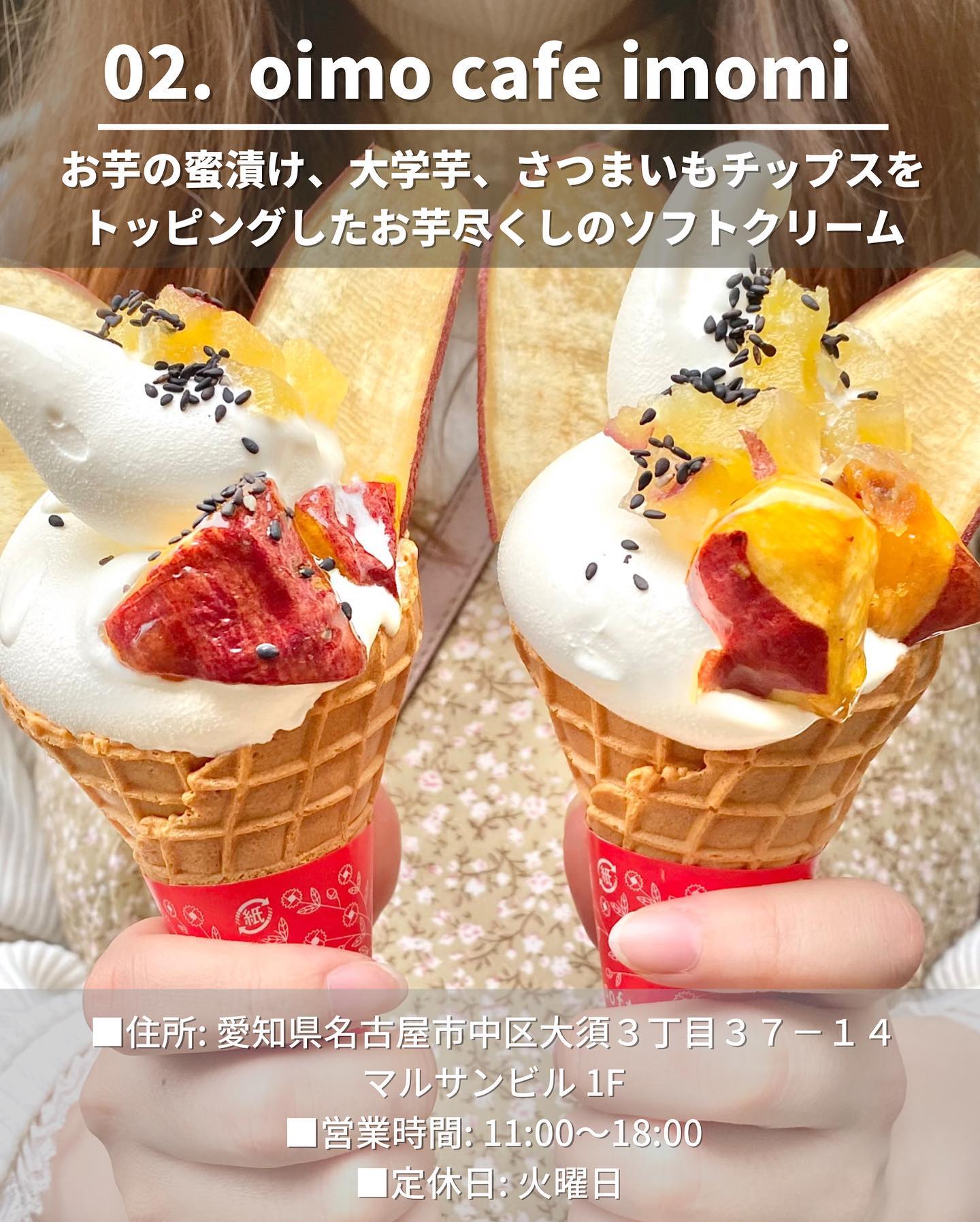 名古屋・大須のさつまいもスイーツ専門店・imomiです。皮ごと焼く『さつまミライジェラート』は濃厚でねっとり、キャラメルソース入りもあります。『imomiソフト』は蜜漬け・大学芋・お芋チップの3種トッピング。テイクアウト中心、11:00-18:00、火曜定休です。