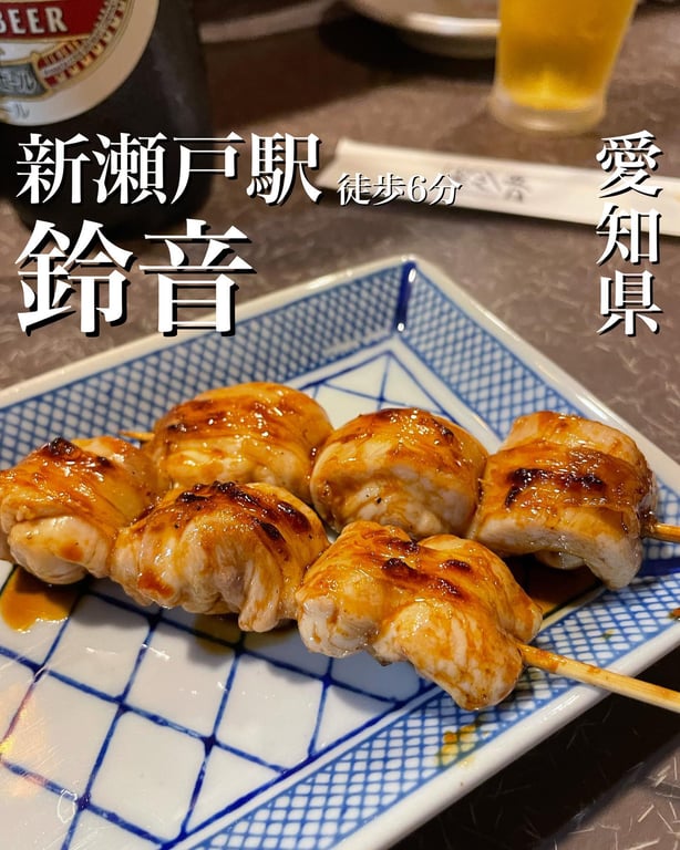 瀬戸市の焼鳥店 鈴音は、もも肉がジューシーでぷりぷり。心臓・しろ・ささみをおろし醤油で味わえる、雰囲気の良いお店です。新瀬戸駅から徒歩6分、17:00-24:00、日曜休。