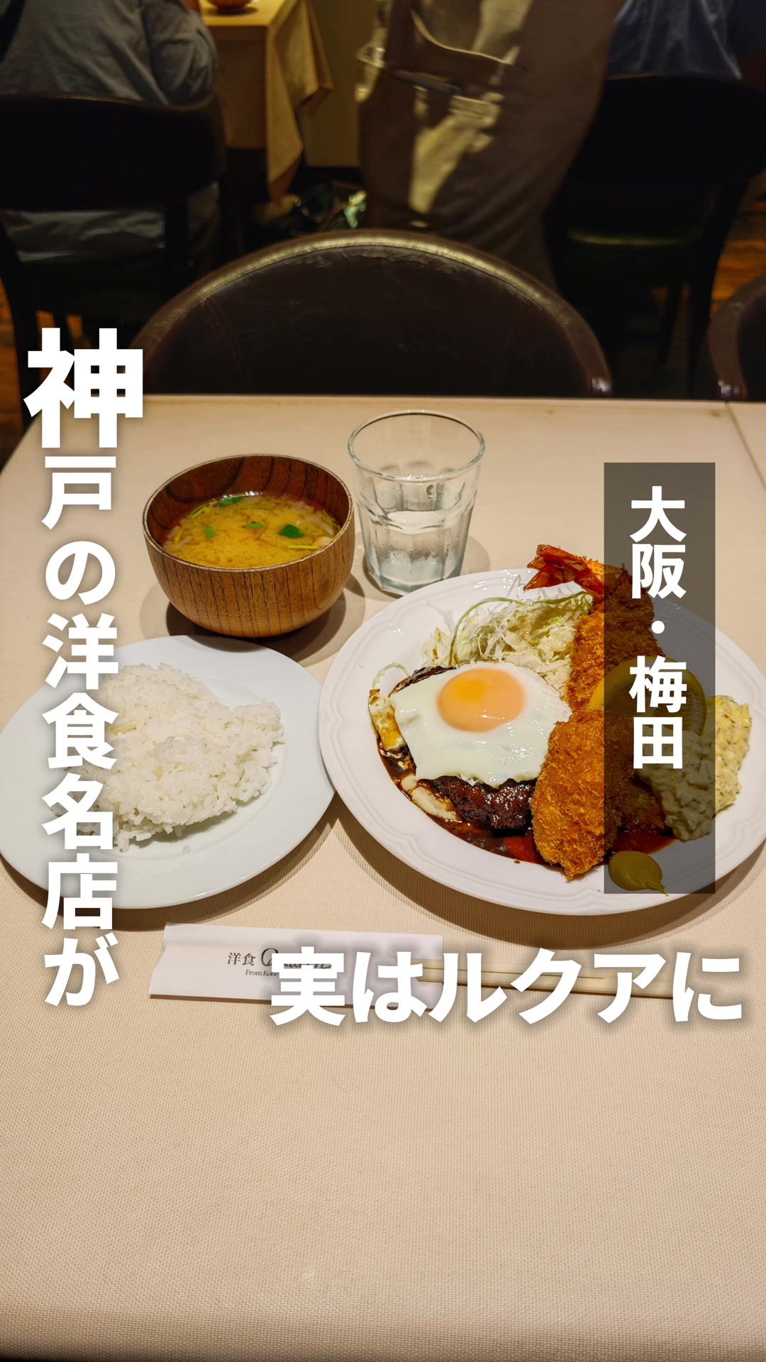 大阪駅直結のルクア大阪10階にある洋食店です。神戸洋食の味を大阪で楽しめ、洋食百名店にも選出されています。ランチ人気No.1はスペシャルセットで、ハンバーグ・大海老フライ・クアトロコロッケです。ご飯・味噌汁・サラダ付きで、おかわり自由です。