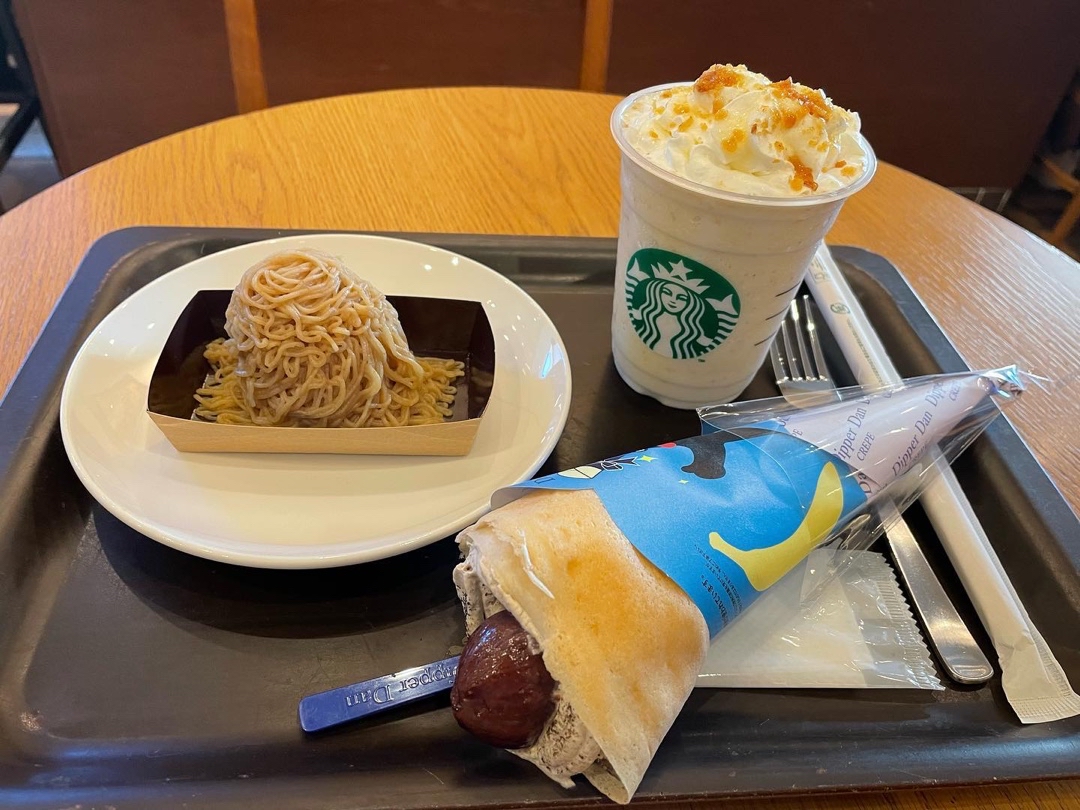 季節限定のフラペチーノとスイーツが楽しめる店舗です。スタバはホリデーのストロベリーメリークリームフラペチーノをはじめ、秋冬の味覚を取り入れたメニューが特徴。ディッパーダンは天空のほうじ茶と渋皮栗のアイスモンブラン、ブルーベリーレアチーズケーキなど和洋の季節メニューを揃えています。