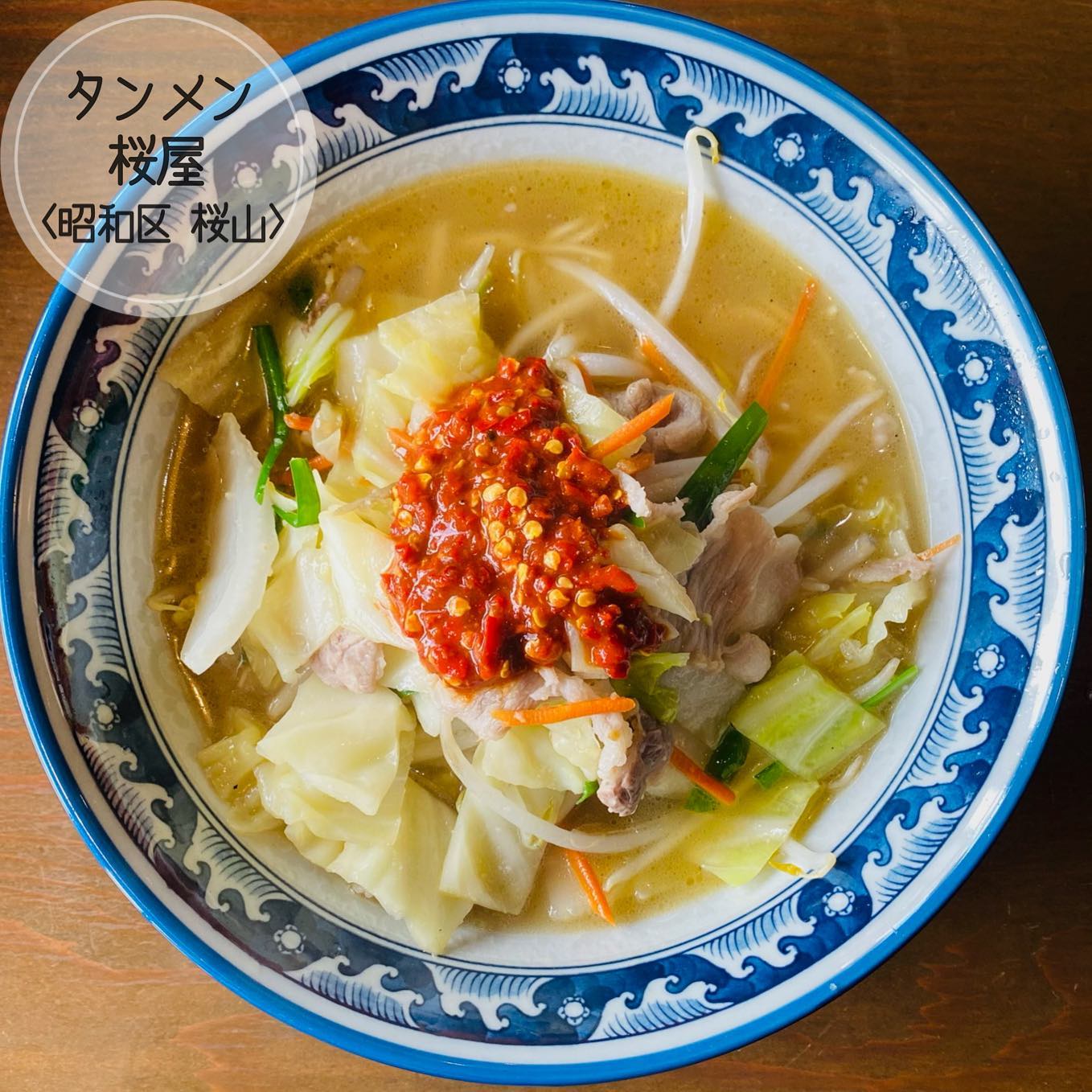名古屋市昭和区桜山のタンメン専門店・桜屋。野菜たっぷりの甘い鶏ガラスープに辛味を別添で調整。木を基調した店内と石畳の入口が印象的で、掘りごたつ席を含む座席数が多い。駅近・専用駐車場有り。タンメンは650円。