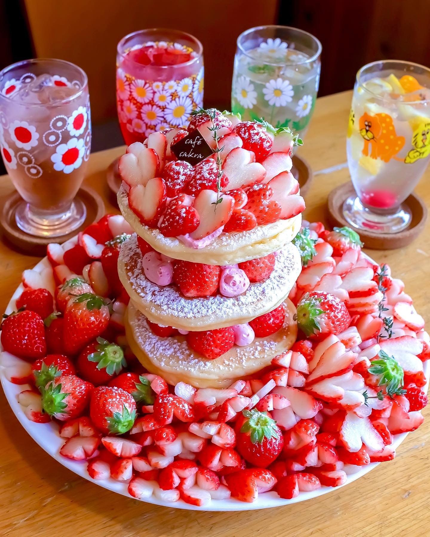 姫路市広畑区東新町の cafe cakra は、100粒のいちごを使ったスペシャルホットケーキが看板メニューです。まるごといちごやハート型のいちごが並び、粒数は事前の相談で50粒・30粒などにも柔軟に対応します。