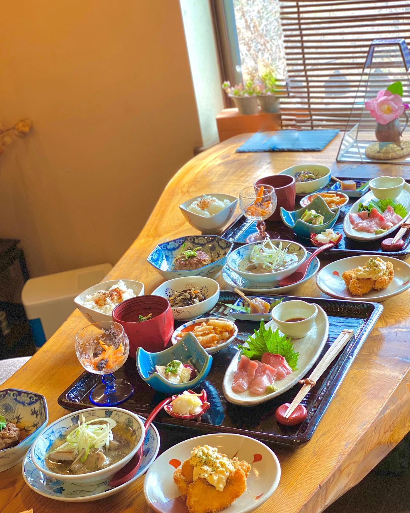 志度の和の趣が漂う小さな食事処。日替わりランチは主菜2品+デザート・ドリンク付きでボリューム満点。旬の野菜と優しい味付けが特徴で、器や花に心が和みます。3部屋あり、一枚板のテーブル席でゆったり楽しめます。