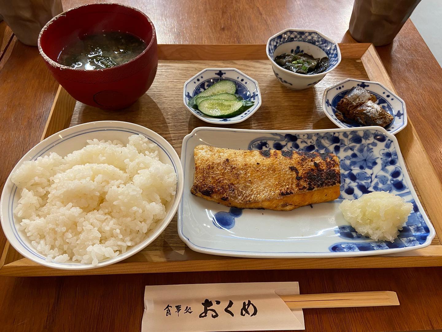 好きな焼き魚とあおさの味噌汁、ご飯、きゅうりの浅漬け、かぼちゃの煮物がつくセッ...
