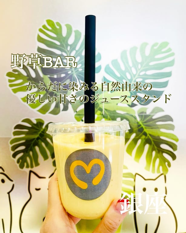 新橋駅徒歩1分、銀座ナイン1号館1階の野草Barは、無添加の青汁と新鮮フルーツのスムージーが自慢。自然由来の優しい甘さと日替わりホットドリンクも魅力。小さなカウンターでイートイン可。
