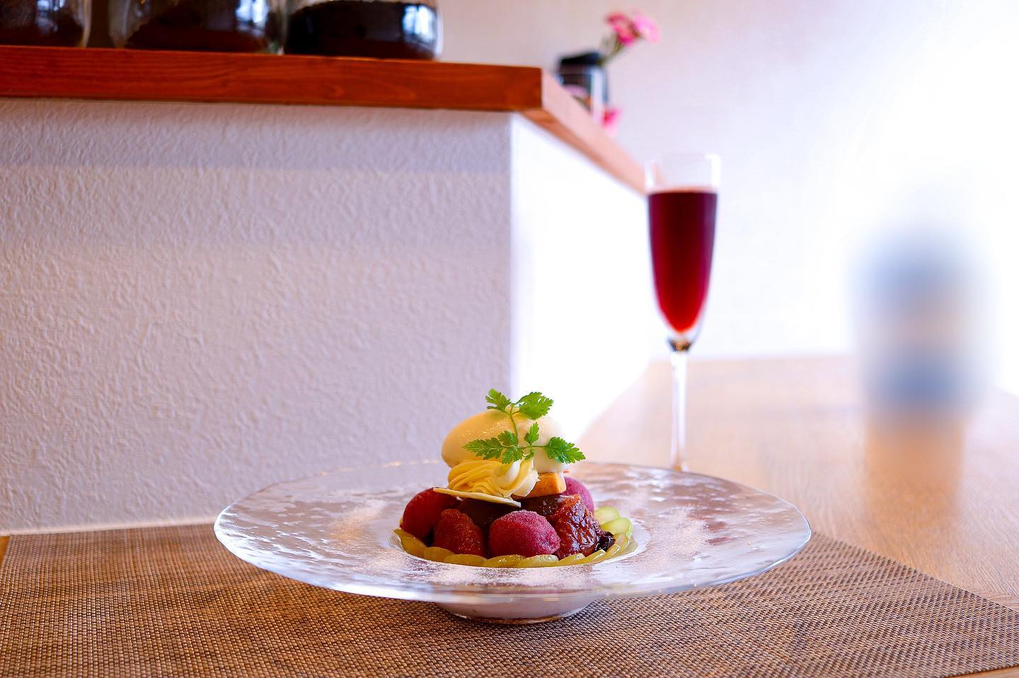 チーズジェラートに巨峰ソルベ、チーズクリーム、赤ワインクリーム、ブドウジュレ、シュト...