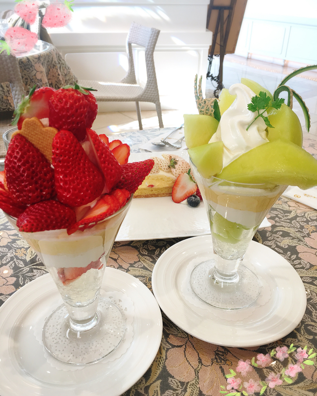 甘いいちご🍓とメロン🍈の#パフェ 💕いつもお客さんいっぱいの人気店💕🌸