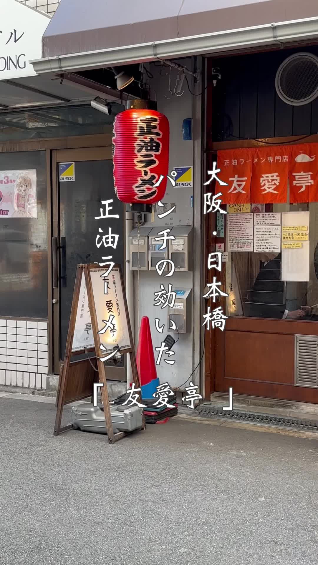 大阪・日本橋の醤油ラーメン専門店。15席の小さなお店ながら1日260杯完売の人気店で、夫婦2人が温かな雰囲気をつくります。看板の正油ラーメンは深いコクとキレが特徴。右ストレート900円は濃口スープ×細麺が決め手。40食限定のでんでんブラックも話題。