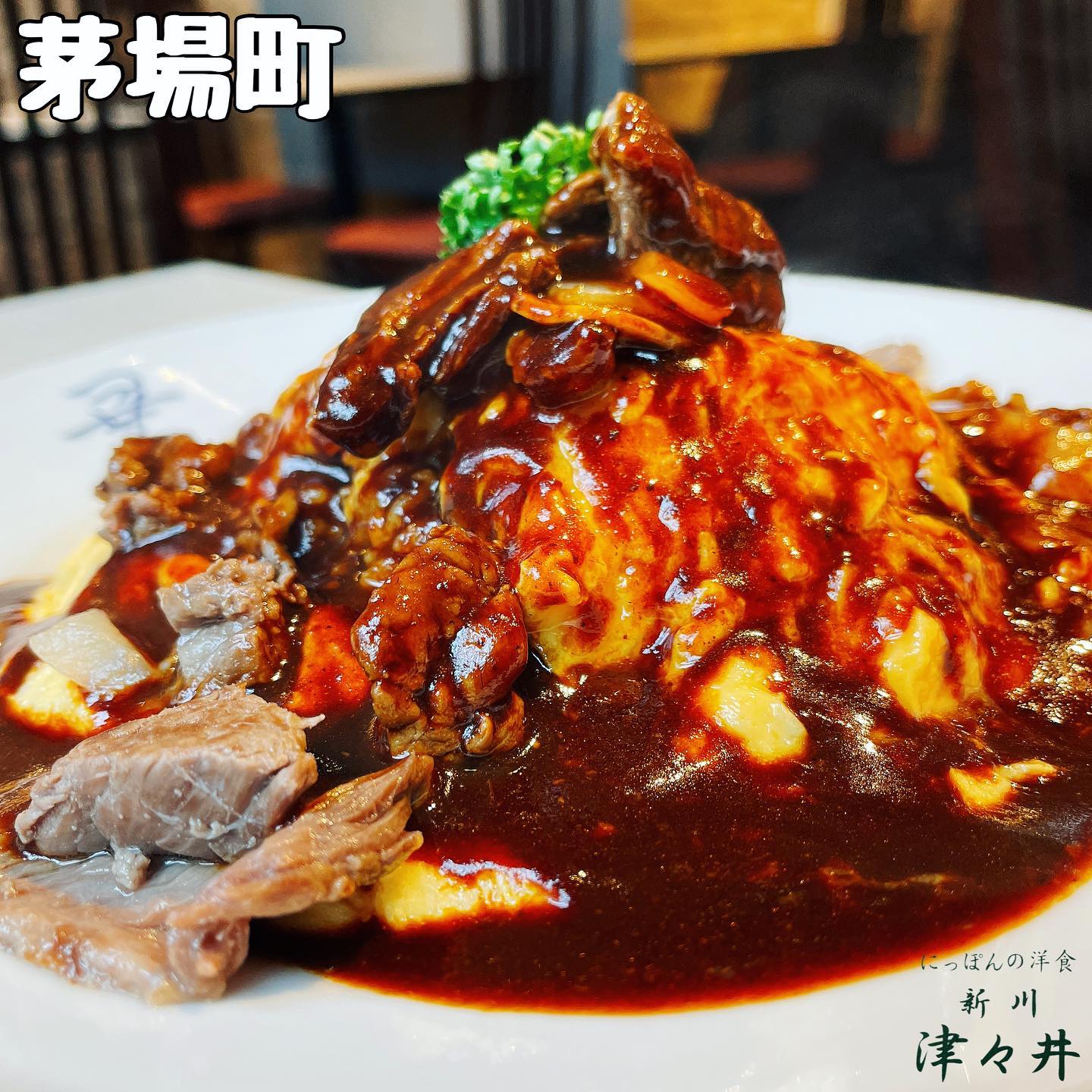 茅場町の洋食店・津々井は、百名店に選ばれる高評価店です。ふわとろのオムライスはタラバガニとトマトの2種ソースを挟む逸品で、分厚い和風ハンバーグ丼など洋食メニューが豊富です。