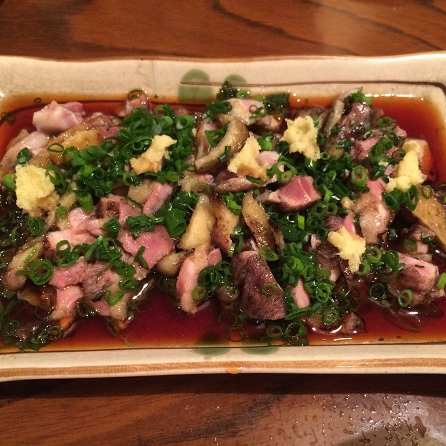 居酒屋「まんとく」の自慢は、じっくり焼き上げたもも焼きです。3日目でも変わらぬジューシーさで、もう一度食べたくなる味。ブロッコリー添えで彩りも豊か。もも焼き1,350円、ブロッコリー400円。