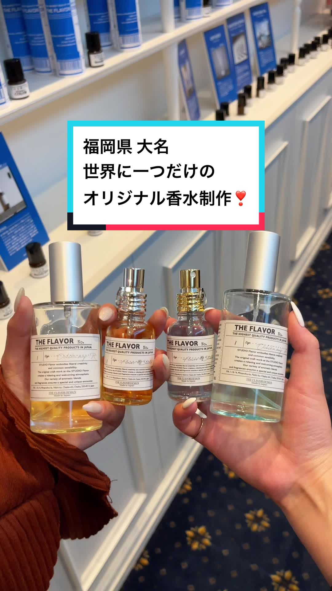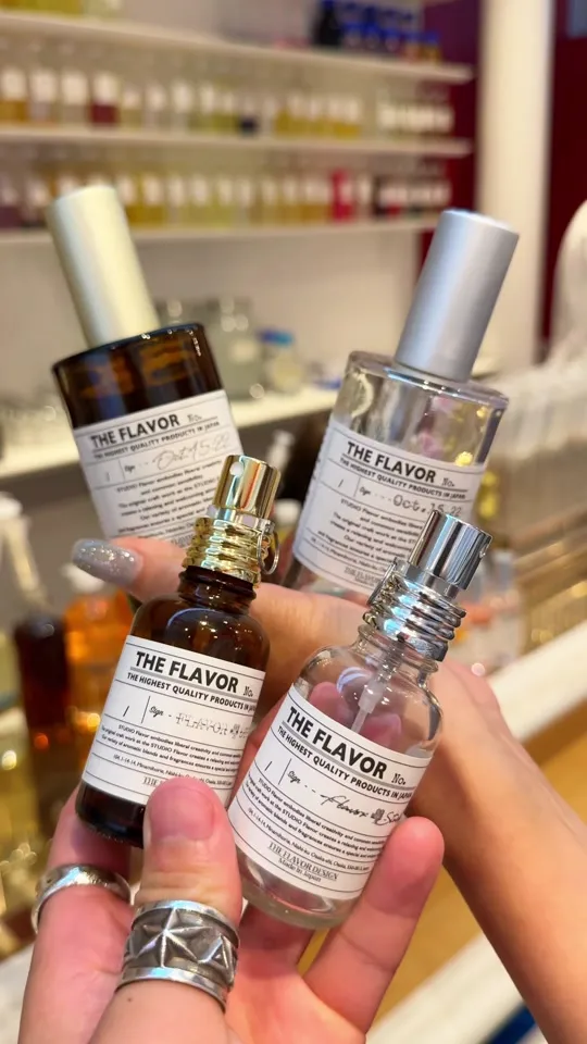 大名のTHE FLAVOR DESIGN STOREは、20種のテスターから自分だけの香りを作れる体験です。完成ボトルは透明・茶色を選べ、+1100円でアトマイザーに色を付けられます。料金は4950円、予約はWebサイトから。