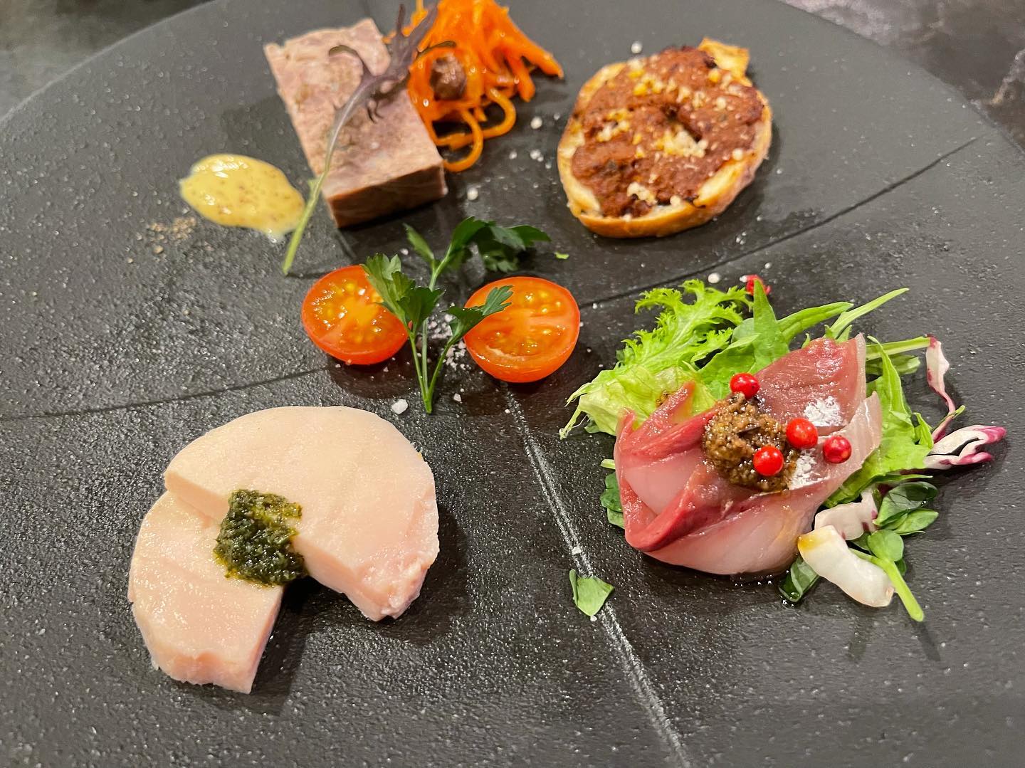 大門駅すぐのイタリアンバル、ブラチェリア バーヴァ。豪快な炭火焼の塊肉が名物で、前菜盛り合わせやラム・黒牛の炭火焼も楽しめます。カウンター席があり、地域食材への拘りとワインの組み合わせが魅力です。