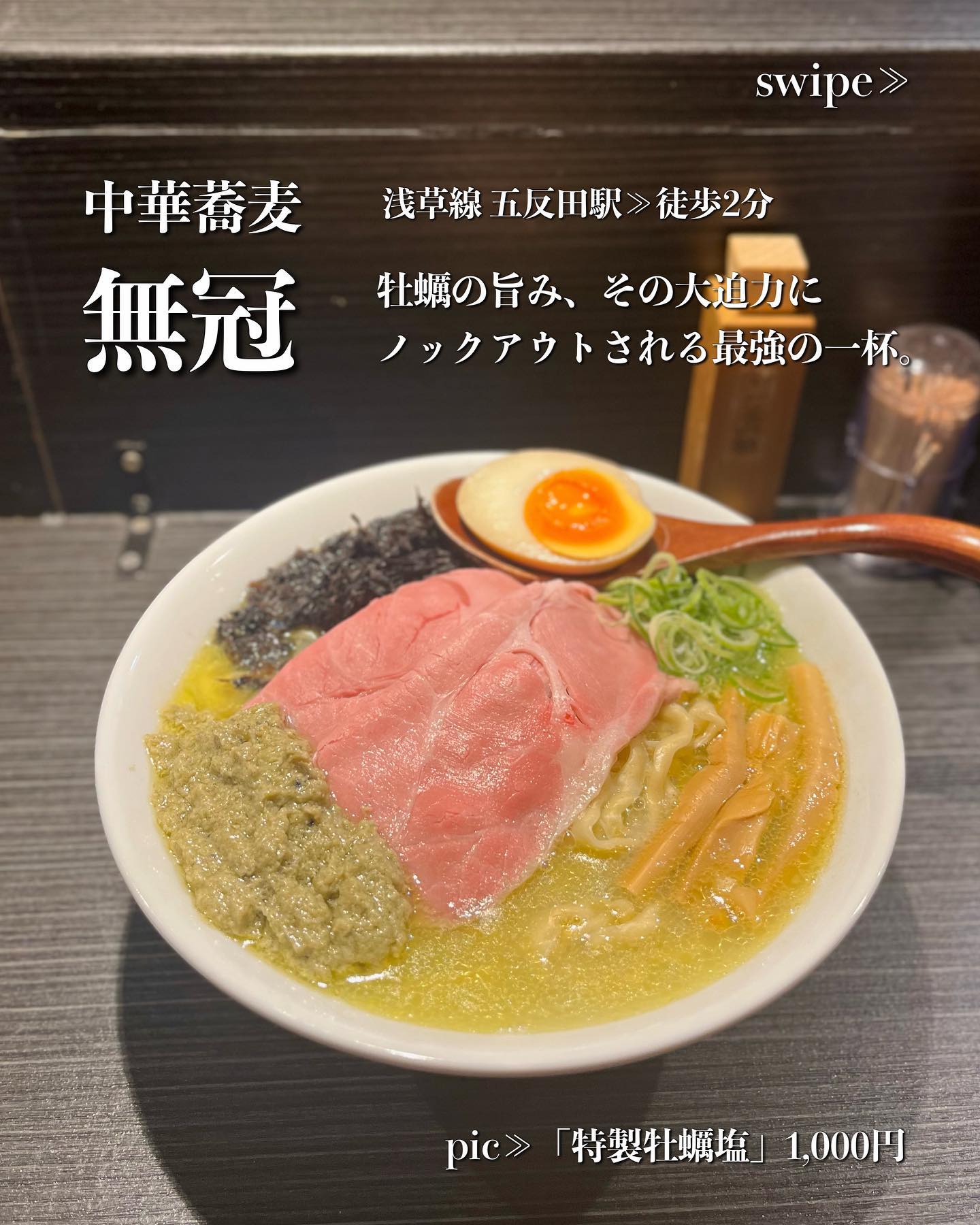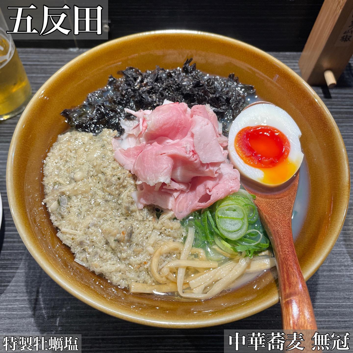 品川区西五反田の「中華蕎麦 無冠」です。特製牡蠣塩ラーメンが看板メニューで、牡蠣ペーストが溶け込む濃厚な旨味と岩海苔の香りが特徴です。6席のカウンターのみの小さなお店で、以前は予約制でしたが現在は並んで味わえます。