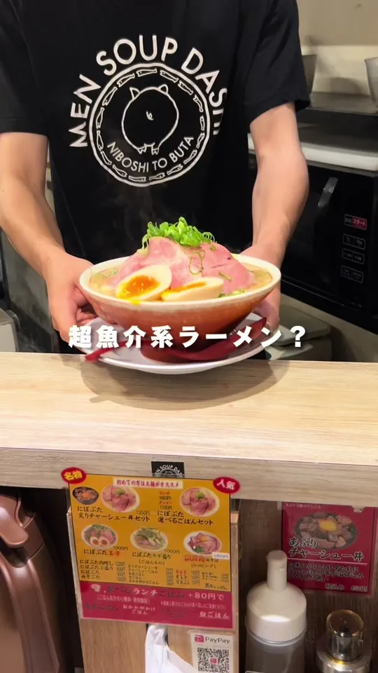 広島市南区段原のらーめん専門店 煮干しと豚は、超魚介系の濃厚スープと細麺・太麺が選べる独自の組み合わせが魅力。炙りチャーシュー丼とトロトロ煮卵も絶品です。