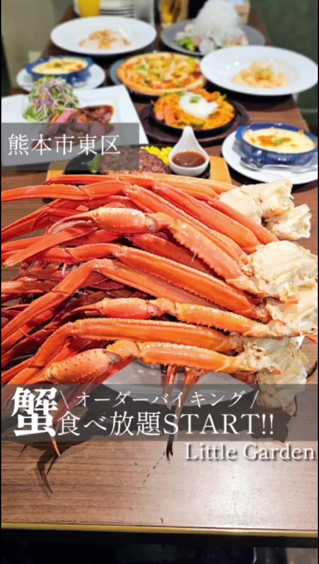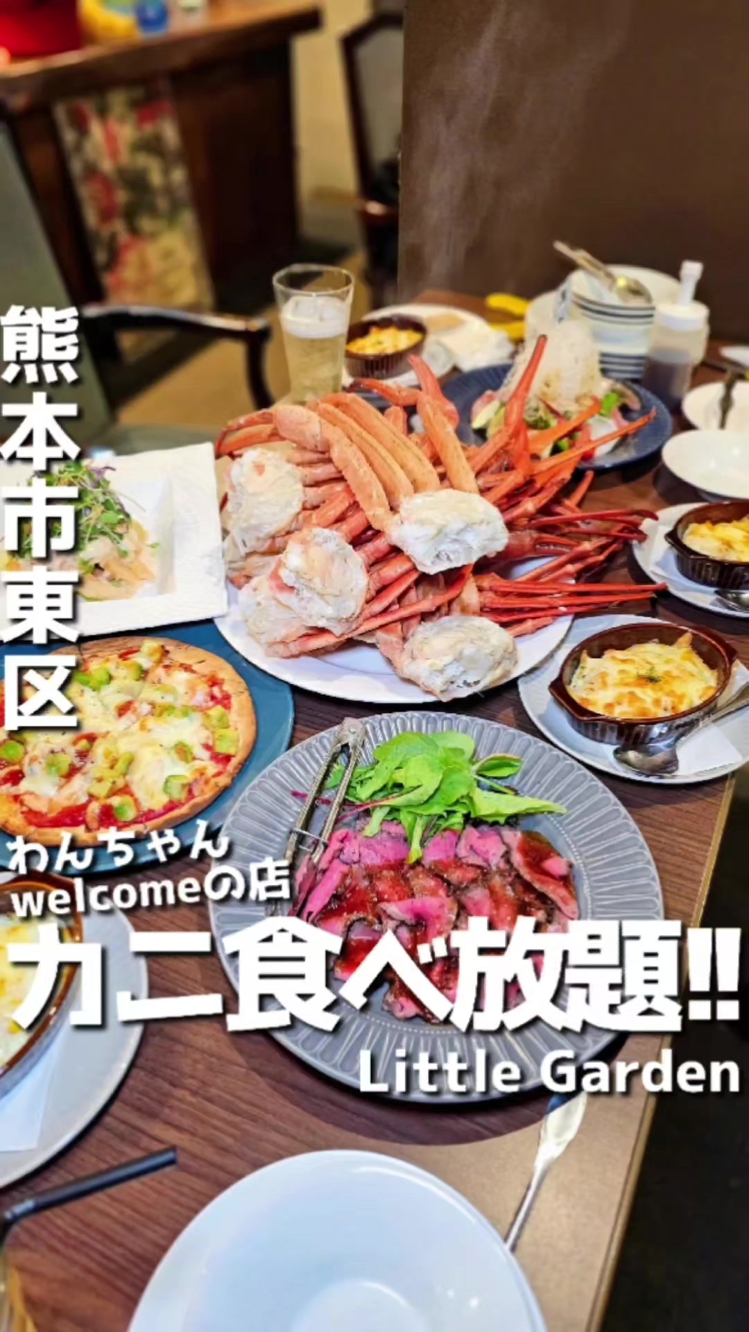 熊本市東区長嶺南の Little Garden は、夜のみ開催の蟹食べ放題が魅力です。蒸し蟹は濃厚で、50種以上のオーダーバイキング料理も楽しめます。ワンちゃん同伴OKのテント席・バス席が特徴で、完全予約制です。
