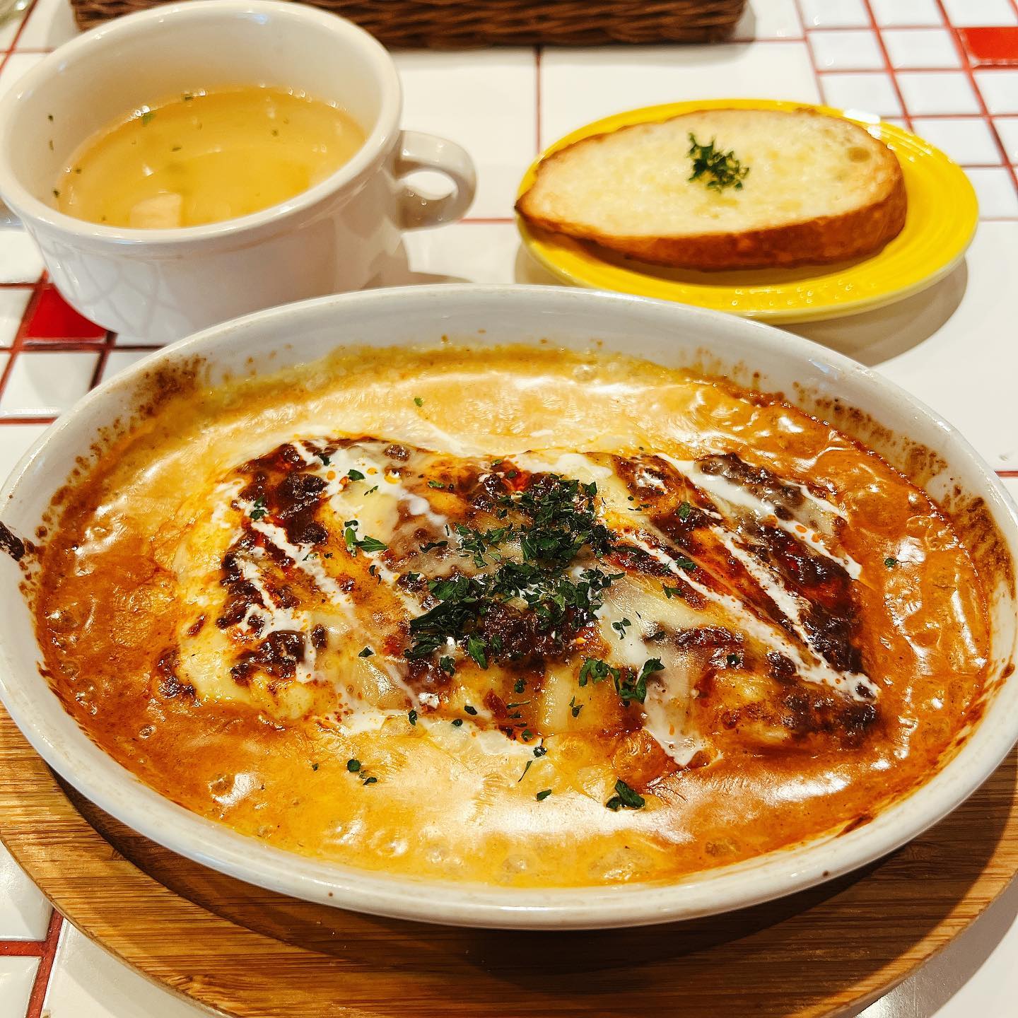 ラザニ屋のラザニア(バゲット、スープ付)1350円。